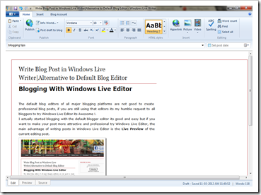 I actually started blogging with the default blogger editor its good and easy but if you want to make your post more attractive and professional try Windows Live Editor, the main advantage of writing posts in Windows Live Editor is the Live Preview of the current editing post.